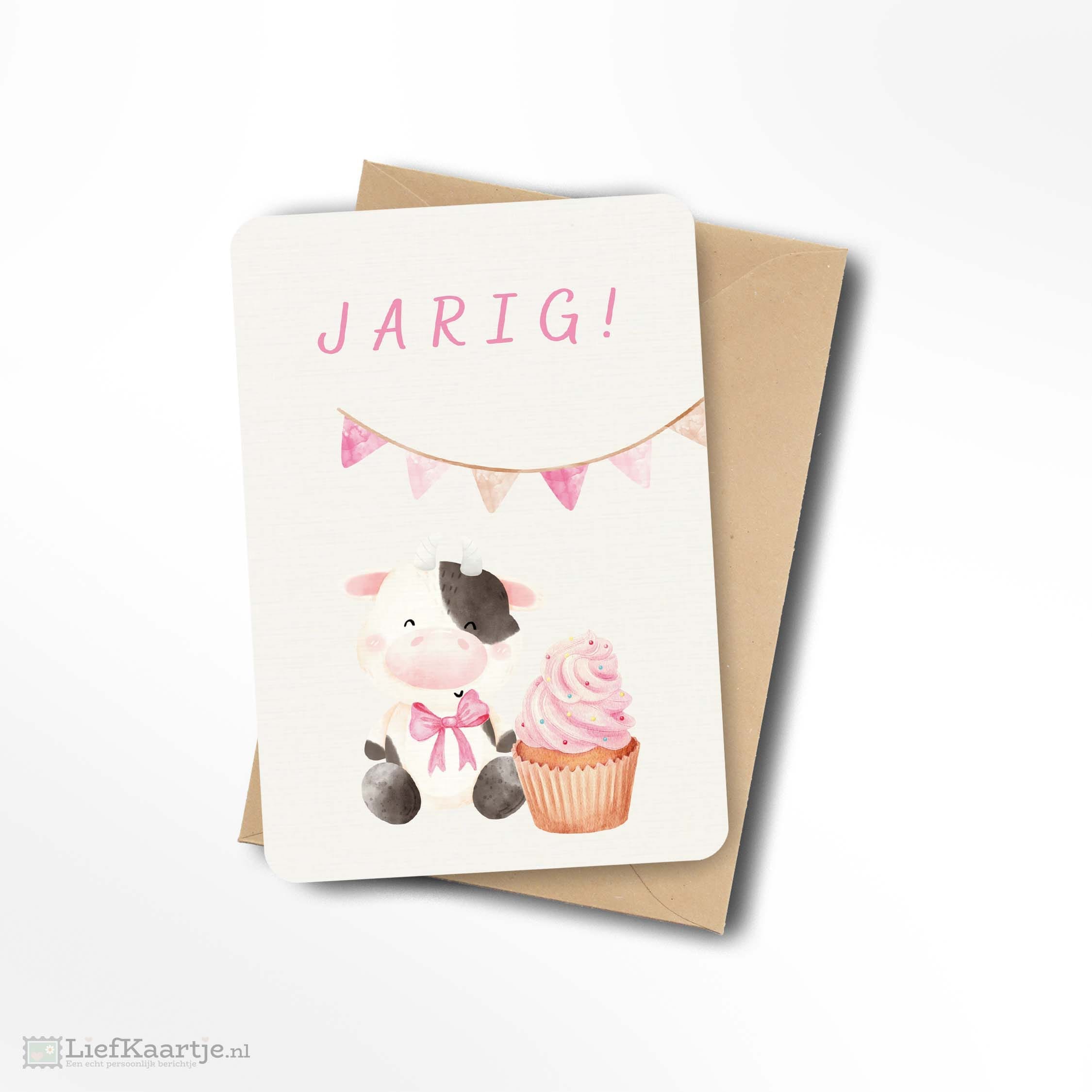 Verjaardagskaart “Jarig!” met Koe en Cupcake